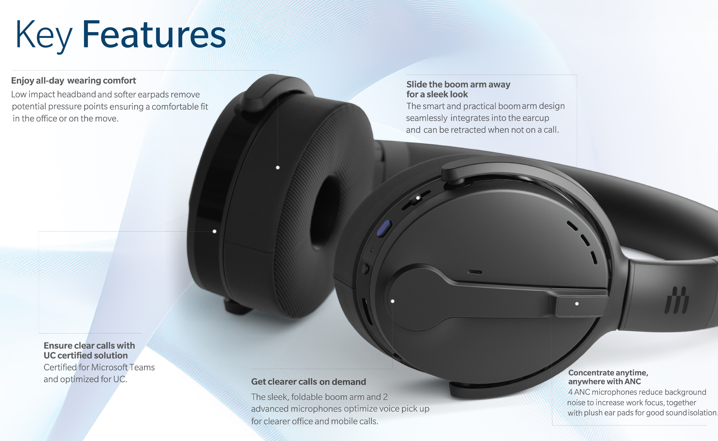 The ADAPT 560 II features a new headband and softer earpads for long-term wearing comfort. A foldable boom arm optimizes voice pick-up while ANC reduces background noise. Switch between two Bluetooth® devices using multi-point connectivity and benefit from up to 41 hours of talk time.