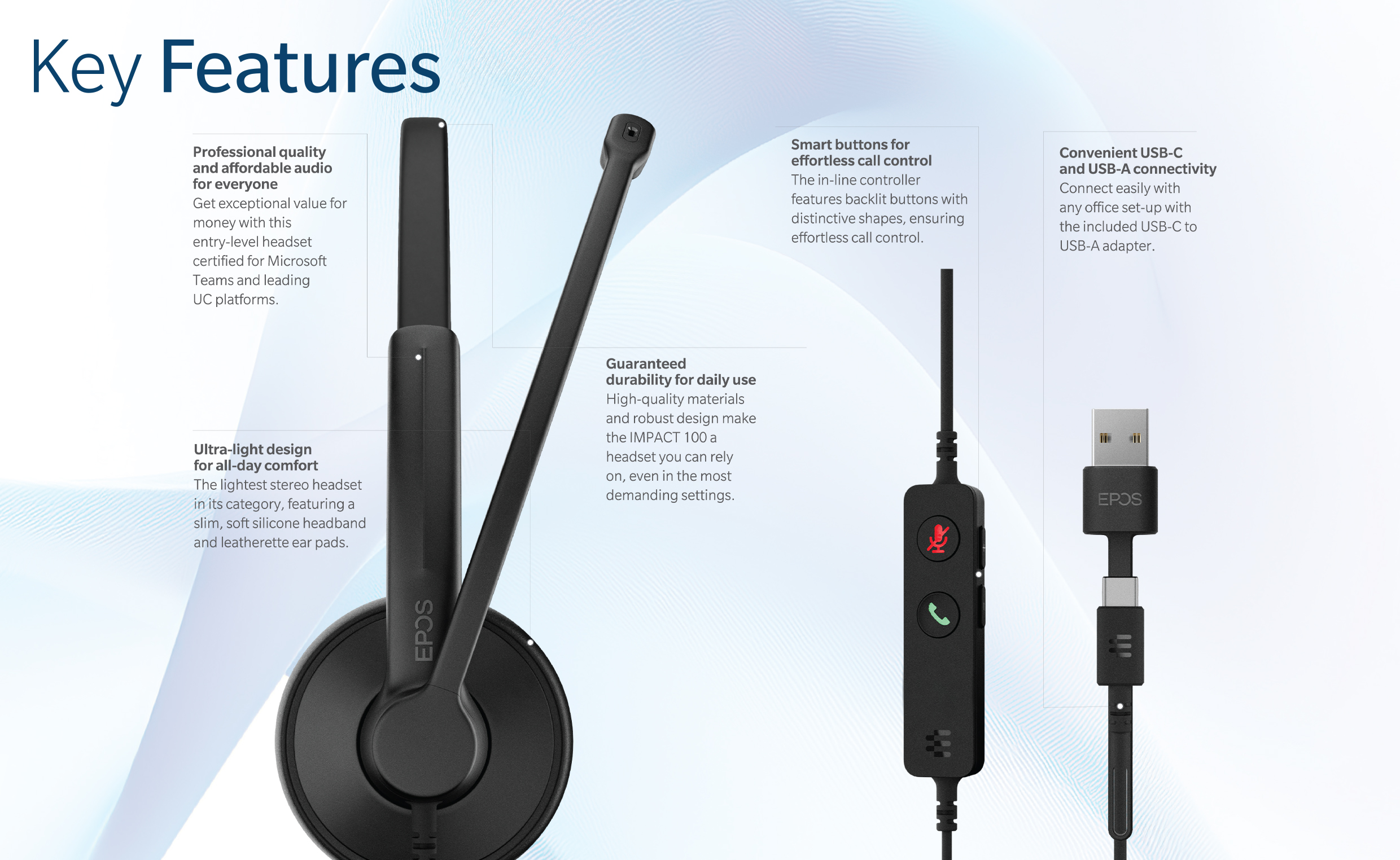The IMPACT 100 is an entry-level headset that delivers exceptional value for money. With smart features that enhance efficiency and an ultra-lightweight design, it is an ideal headset for talk-heavy professionals.