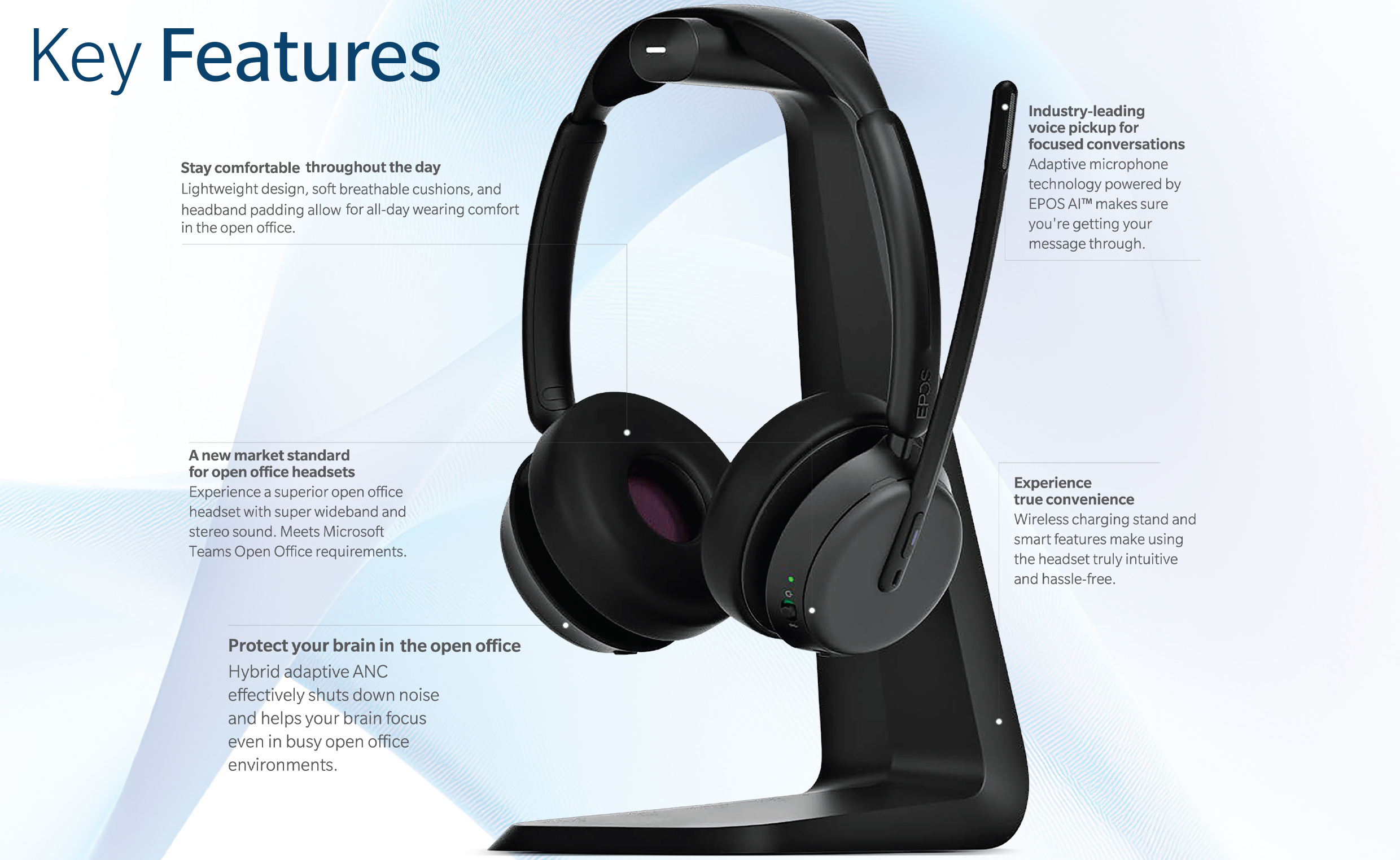 IMPACT 1060T is designed for the New Open Office environment. Built on EPOS BrainAdapt™ technology to reduce brain fatigue with adaptive ANC and industry-leading voice pickup powered by EPOS AI™, making sure you're getting your message through.