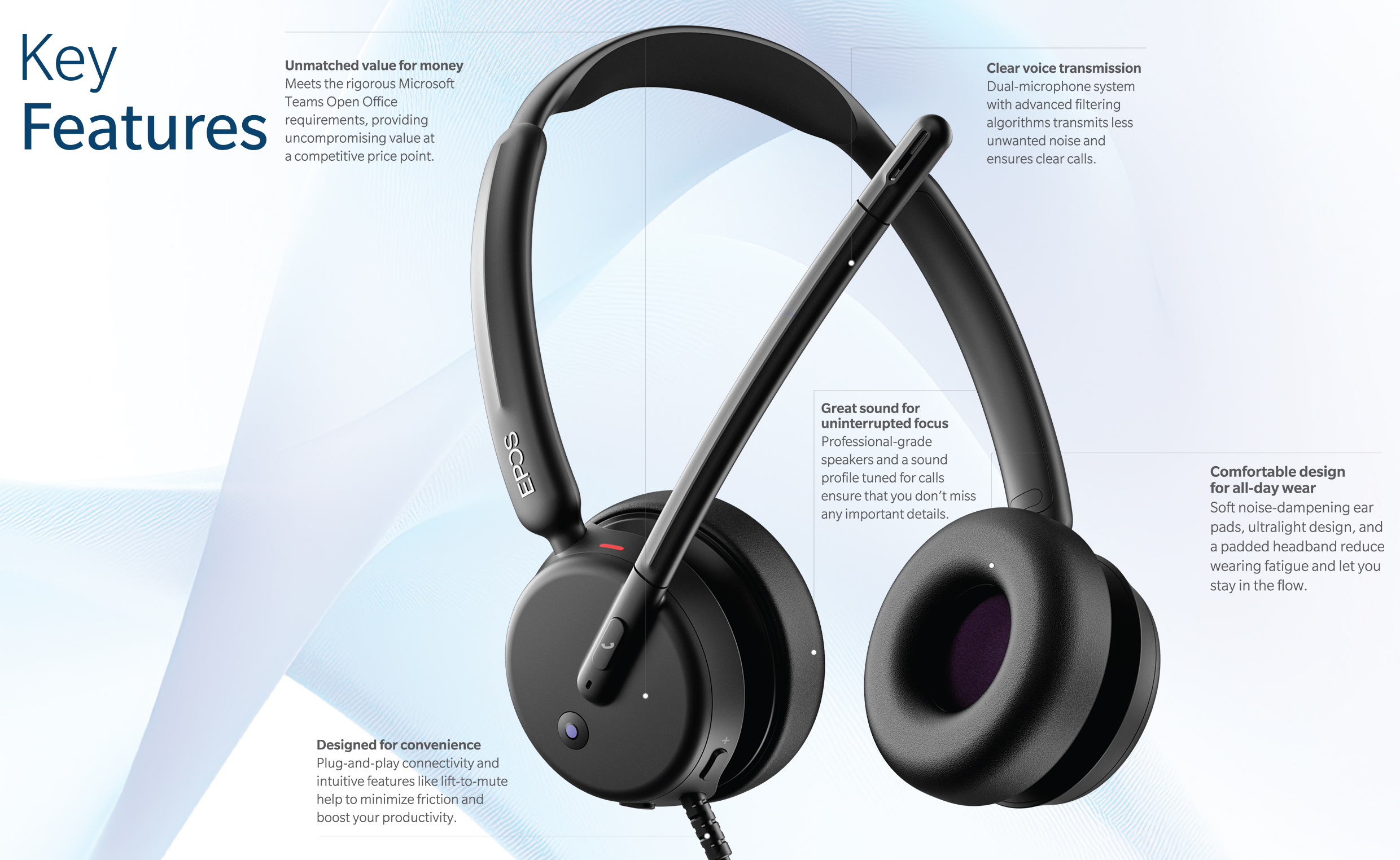 Be heard on any call with a wired headset for hybrid workers that delivers value for money. Advanced noise-filtering technology transmits your voice instead of unwanted noise, while the speakers deliver exceptional sound so that you don’t miss a word.