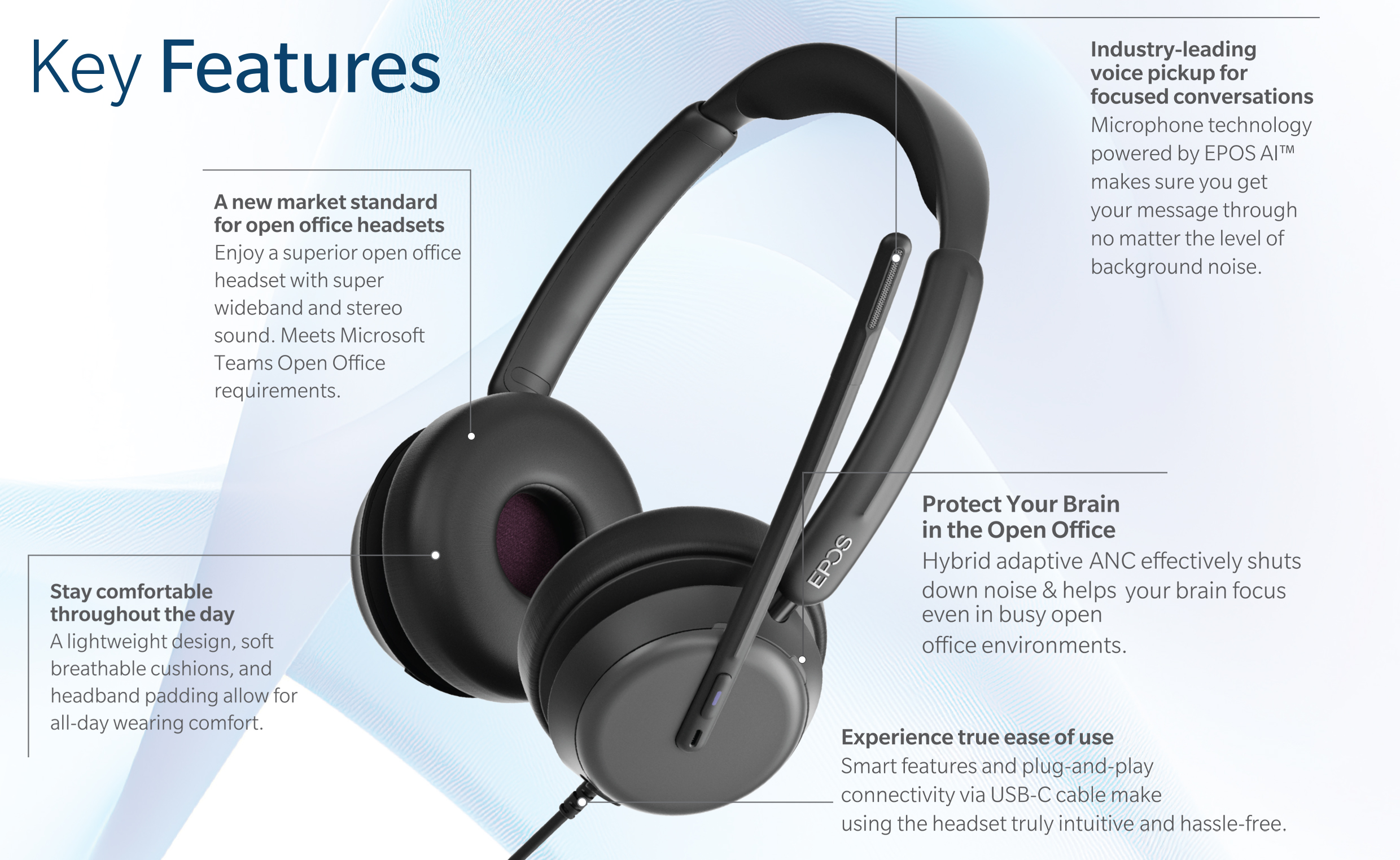 The next generation headset for desk workers in the New Open Office. Increase efficiency by 40%* by improving reaction time whilst multi-tasking to maintain accuracy with EPOS BrainAdapt™, industry-leading voice pickup by EPOS AI™ and adaptive ANC.